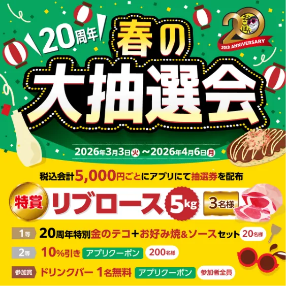 1等:20周年特別金のテコ+お好み焼&ソースセット(20名様)