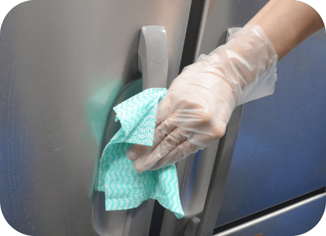 業務中の手袋の交換、キッチン内の消毒から整理整頓。