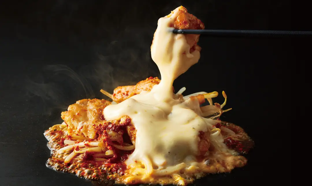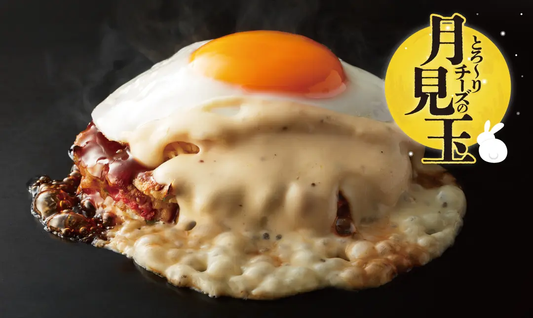 お好み焼きにとろとろの黄身と特製ソース、とろけるチーズがベストマッチ!
