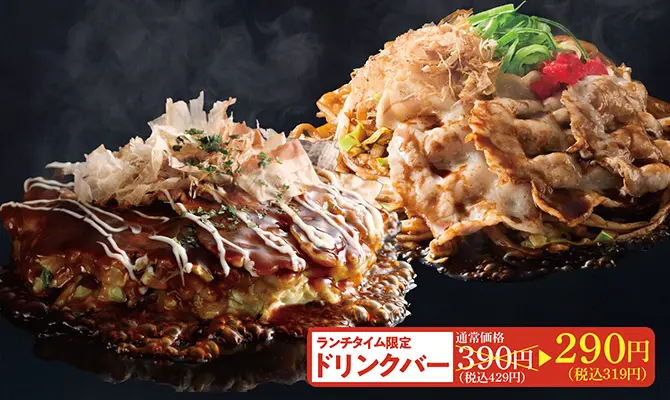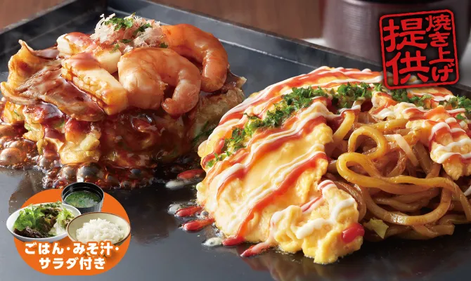 ランチメニューのお好み焼・焼そばは全て厨房で焼き上げてご提供いたします