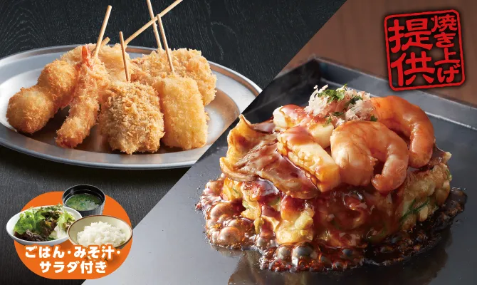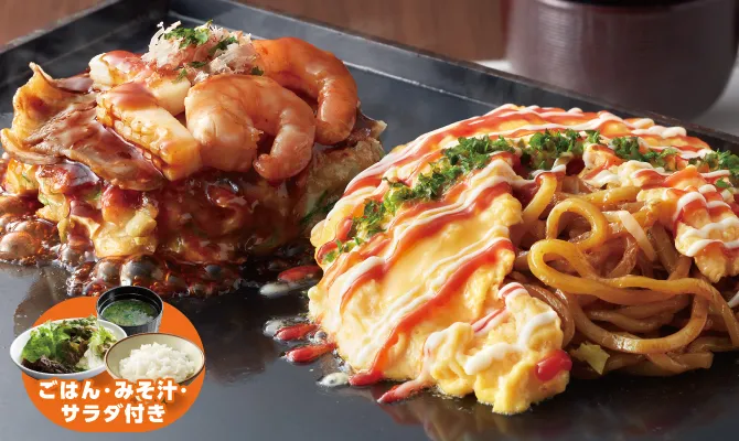 選べるお好み焼(ハーフサイズ)、選べる焼そばは、期間限定を除く全ての種類よりお選びいただけます