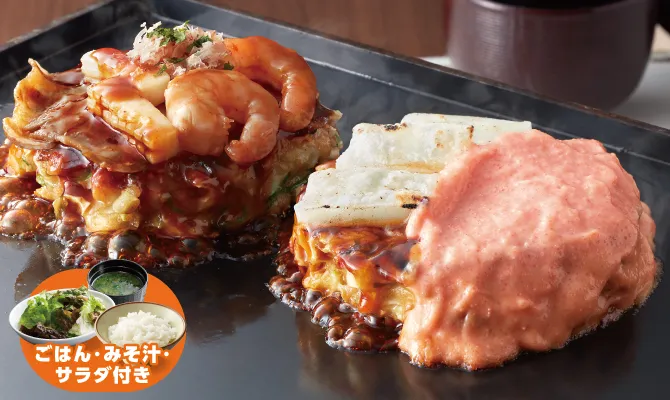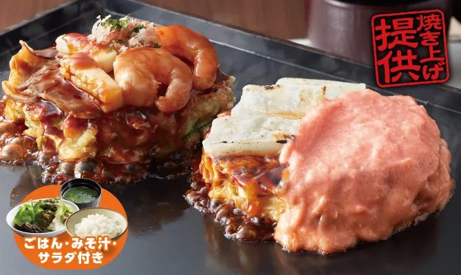 選べるお好み焼(ハーフサイズ)は、期間限定を除く全ての種類よりお選びいただけます