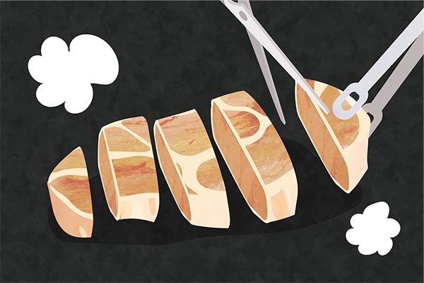 ③ステーキをハサミで一口大にカットし、中心もしっかり火を通す