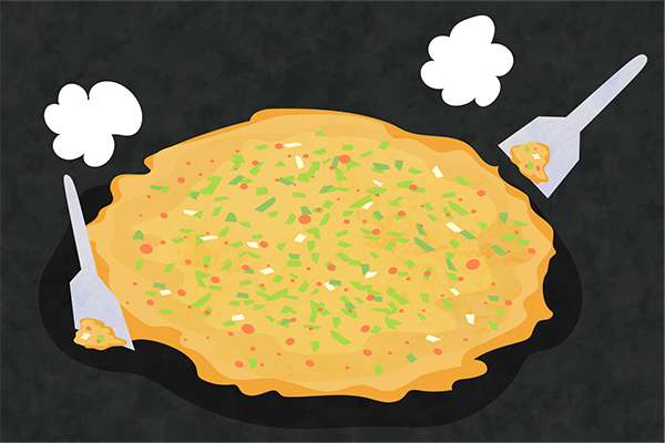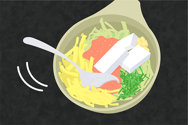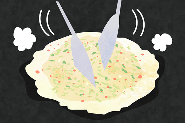 ③テコで混ぜ合わせながら刻んで、丸く平らに伸ばす