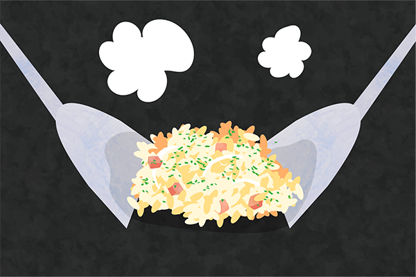 ②バターの上にご飯と具材を乗せて混ぜながら炒める