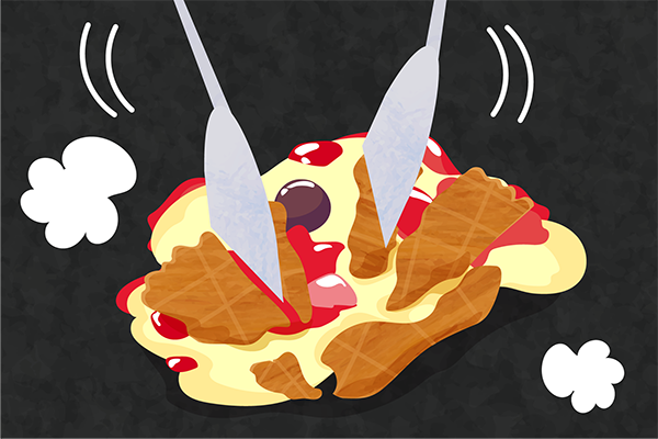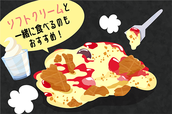 ②ワッフルコーンごと鉄板に乗せて、テコで砕く